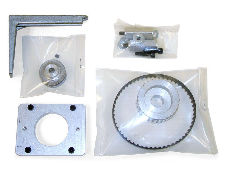 P/N 6500. This kit allows mounting of a stepper motor to a Sherline headstock in place of the standard DC motor. (Click on linked part number for details.) The kit includes a custom bracket that supports the motor and the standoffs that attach to the mounting bracket. Also included are the standoffs, motor mounting bracket, 15-tooth motor pulley, 30-tooth spindle pulley, toothed drive belt and mounting hardware. Not included are the headstock and stepper motor (P/N 67127), which must be purchased separately. (A 10-tooth drive pulley is also available for special order for a slower 3:1 drive ratio instead of the standard 2:1 ratio. Call for details.) |